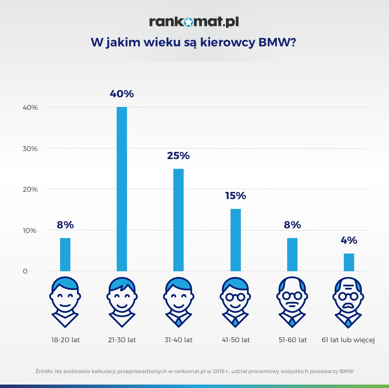 Wśród posiadaczy BMW 8% ma 18-20 lat. 21-25 lat ma kolejne 19%. Największą grupą są osoby w wieku 26-30 lat, którzy stanowią 21% wszystkich właścicieli tej marki. Średni wiek kierowcy BMW wynosi 34 lata. To o 4 lata mniej niż od przeciętnego polskiego kierowcy i najmniej ze wszystkich marek. Ponadto tylko 16% posiadaczy BMW to kobiety.
