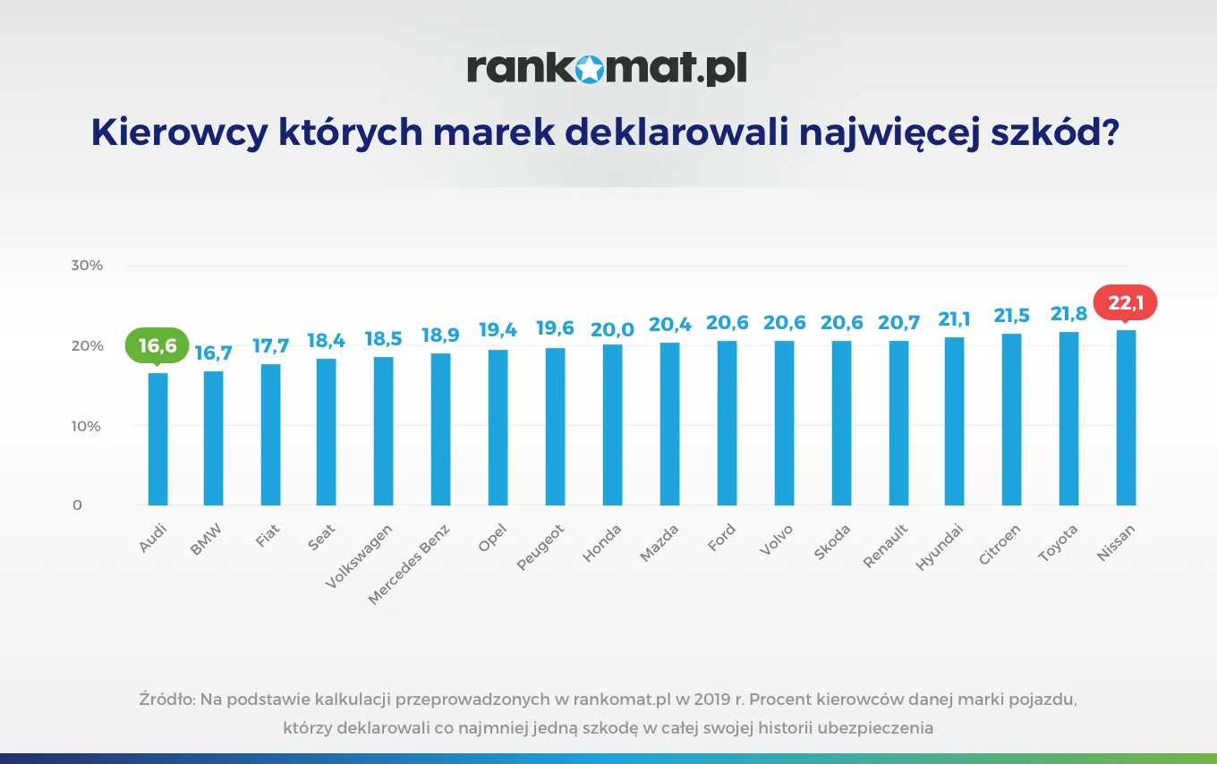 Pomimo stereotypów i młodego wieku kierowcy BMW rzadko deklarują szkody. W 2019 roku zaledwie 16,7% z nich przyznało się do spowodowania co najmniej jednej szkody w całej swojej historii ubezpieczenia. Pod tym względem nieznacznie wyprzedzili ich jedynie posiadacze Audi (16,6%). Na drugim biegunie znaleźli się właściciele aut japońskich takich jak Nissan (22,1%) czy Toyota (21,8%). Oczywiście kierowcy nie muszą podawać prawdy w deklaracjach, jednak zostanie ona zweryfikowana przez UFG podczas zakupu polisy OC.