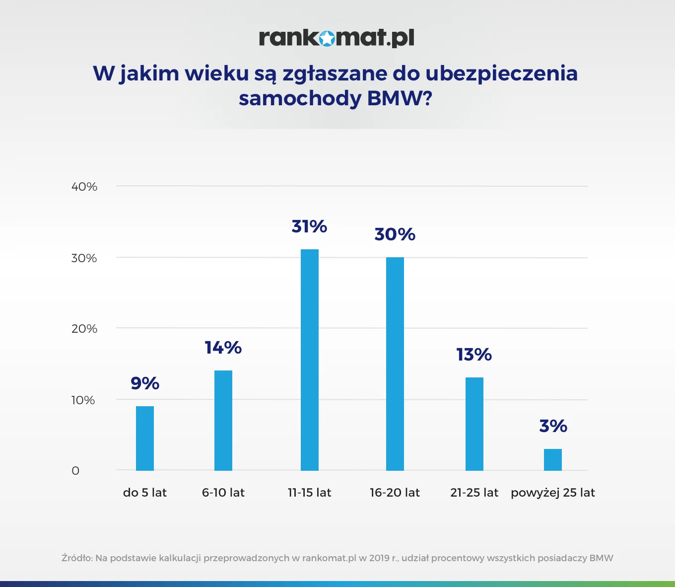 Choć z każdym rokiem rośnie sprzedaż nowych modeli BMW, to wciąż najwięcej miłośników tej marki jeździ autami kilkunastoletnimi. Ponad 30% BMW na polskich drogach to pojazdy mające 16-20 lat. Prawie tyle samo jest w przedziale 11-15-lat. Ponad dwudziestoletnich jest 14,5%, natomiast te najmłodsze (do 10 lat) stanowią 22,8%.