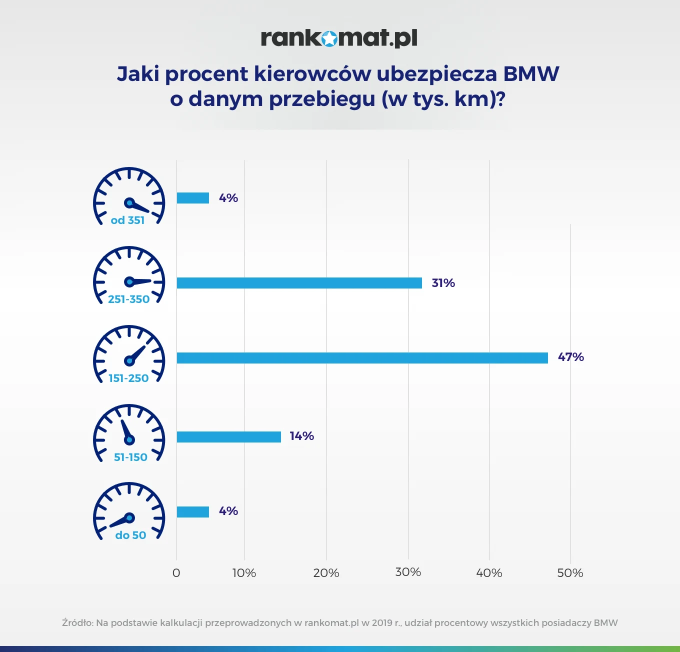 W przypadku BMW potwierdza się jednak stereotyp o dużych przebiegach na liczniku. Średnia przejechanych kilometrów dla BMW wynosi 224 tys. km. Przeciętny polski samochód ma ich mniej o 34 tys. km. Więcej na licznikach mają jedynie samochody Audi, choć tylko o 2 tys. km. Większość rodaków potrzebuje ok. 2 lat, aby tyle przejechać.