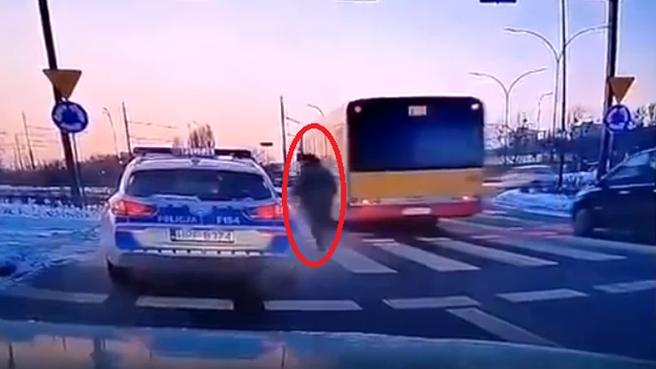Pieszy ominął stojący na środkowym pasie autobus, a następnie próbując obejść stojący na lewym pasie radiowóz, został przez niego potrącony i upadł na jezdnię.