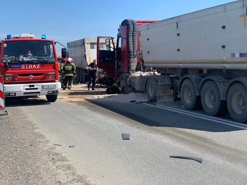 Do zdarzenia doszło w poniedziałek w godzinach przedpołudniowych, na 16. Kilometrze drogi krajowej nr 5 w powiecie świeckim. Ze wstępnych policyjnych ustaleń wynika, że auto osobowe dostało się między dwie ciężarówki.