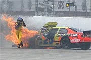 Kierowca wyścigowy Kenny Wallace ucieka z płonącego samochodu po kolizji do jakiej doszło podczas wyścigu serii NASCAR GFS Marketplace 400 na torze Michigan International Speedway w Brooklyn.