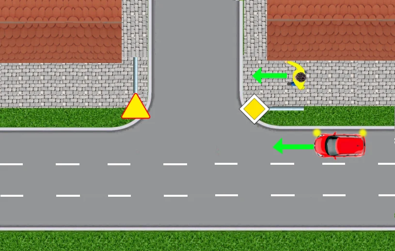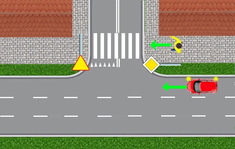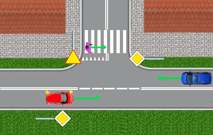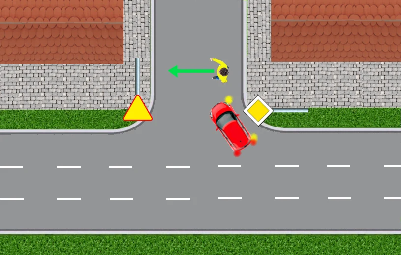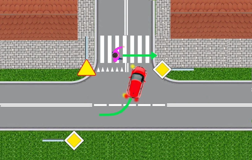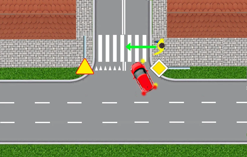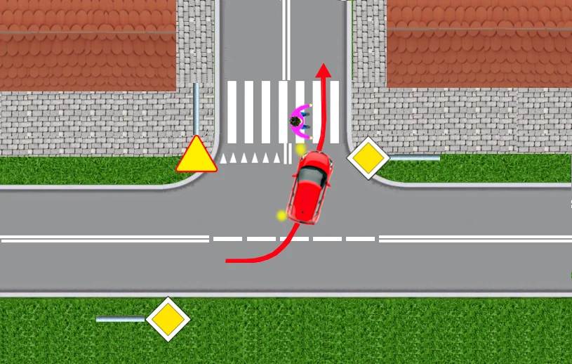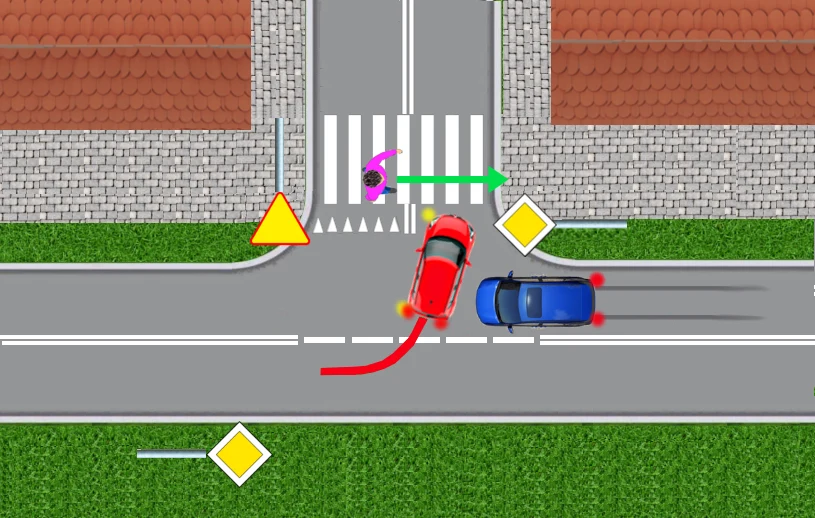 Nie zwraca przy tym uwagi na przejście dla pieszych. Kiedy rozpędzony czerwony samochód zbliża się do przejścia, dopiero wtedy kierowca zauważa idącego przechodnia. Jeden, bardziej bezczelny, przejedzie w tej sytuacji przed nosem pieszego. Drugi zahamuje przed przejściem, ale wtedy może stworzyć groźną sytuację dla kierowcy granatowego auta: