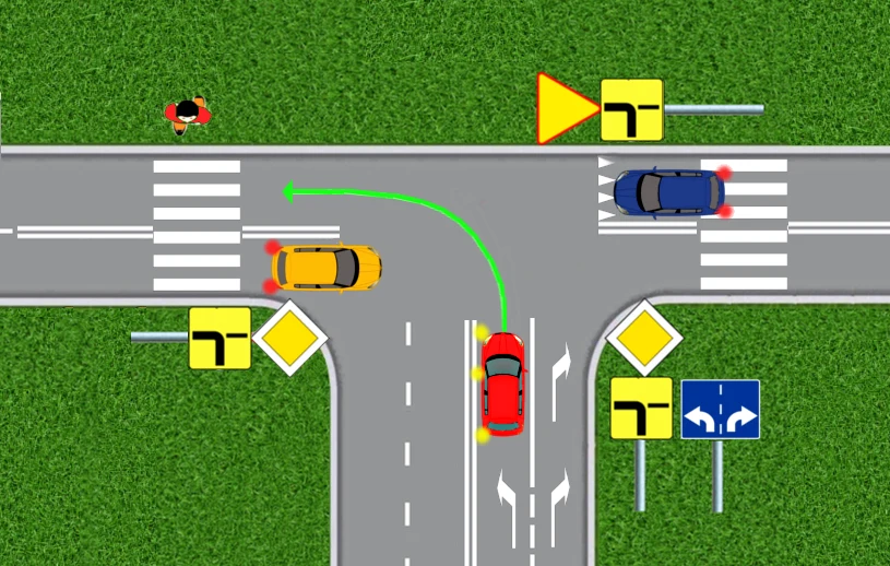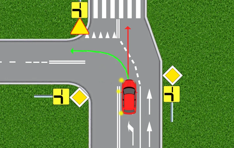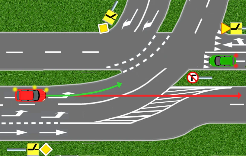 Kierowca czerwonego auta musi sygnalizować zamiar skręcenia na skrzyżowaniu w lewo, chociaż zajmuje pas ruchu przeznaczony tylko do skręcania w tym kierunku. Ale, oczywiście czysto teoretycznie i niezgodnie z oznakowaniem, istnieje możliwość pojechania prosto. Jeśli tak, to kierunkowskaz należy włączyć.