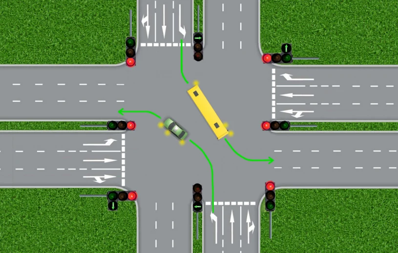 Tutaj z kolei mamy sygnalizatory kierunkowe. Zarówno kierowca zielonej osobówki, jak i kierowca autobusu mogą tylko skręcać w lewo, nie wolno im pojechać w żadnym innym kierunku. Mimo to zmieniają oni kierunek jazdy, a więc muszą sygnalizować taki zamiar.
